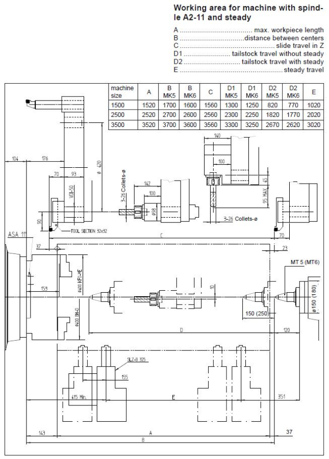 Мощный главный шпиндельРевольверная голова с приводными позициямиСтабильная ось YСистема ЧПУ Siemens или FanucЛюнет для обработки длинных валовТЕХНИЧЕСКИЕ ХАРАКТЕРИСТИКИКЛЮЧЕВЫЕ ОСОБЕННОСТИРабочая зонаПеремещение по осям X/Y: 420 / 180 ммПеремещение по оси Z: 1560 / 2560 / 3560 ммДиаметр обрабатываемого прутка: 95 / 110 ммМакс. диаметр точения: 680 ммМакс. диаметр проворота над станиной: 840 ммБыстрый ход по осям X/Y/Z: 24/12/30 м/минТермостабильная конструкцияВысокая точность обработкиСтабильная ось Y с большим ходом12 приводных инструментов VDI50Высокая скорость линейных перемещенийКомпактностьГлавный шпиндельМакс. скорость вращения 3500 / 2500 (2000) об/минМакс. мощность 33 / 52 кВтМакс. крутящий момент 800 / 2480 (3400) НмРевольверная головаКоличество инструментов/из них приводных: 12 + 12 / 12Размер VDI: 50 / ВМТ65РМакс. скорость: 4000 об/минМакс. мощность: 10 кВтМакс. крутящий момент: 60 НмБРОШЮРА MAXXTURN 110Задняя бабкаКонус: МК5 (МК6)Перемещение: 1300 / 2300 / 3300 ммГабариты и весГабаритные размеры (ДхШхВ): 6780 / 7800 / 9200х2470х2530 ммВес станка: 14000 / 16000 / 19000 кгГАБАРИТНЫЙ ЧЕРТЁЖЧЕРТЁЖ РАБОЧЕЙ ЗОНЫ