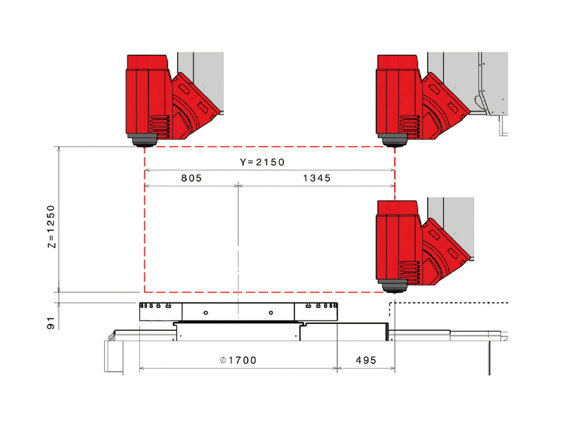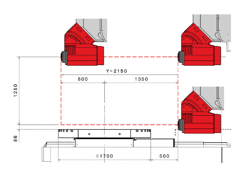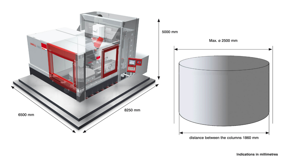 Портальный фрезерный центр для 5-ти осевой обработкиБольшая рабочая зона с удобным доступомФрезерно-токарный стол (опция)Система ЧПУ Heidenhain или SiemensТЕХНИЧЕСКИЕ ХАРАКТЕРИСТИКИКЛЮЧЕВЫЕ ОСОБЕННОСТИРабочая зонаПеремещение по осям X/Y/Z: 1800/2150/1250 ммБыстрый ход по осям X/Y/Z: 60/60/60 м/минМакс. диаметр заготовки 2500 ммФрезерная и токарная обработка за один установФрезерная голова с отрицательным углом обработки 15 град.Обработка заготовок размером до ø 2500 x 1250 ммИнструментальный магазинКоличество позиций: 88 / 122 / 203Механическая фрезерная головаМакс. мощность: 48 кВтМакс. крутящий момент: 750 НмСкорость: 12000 об/минИнструментальный конус ISO50БРОШЮРА UMILL 1800Фрезерная голова с высокоскоростным шпинделем Е58Макс. мощность: 58 кВтМакс. крутящий момент: 372 НмСкорость: 12000 об/минИнструментальный конус HSK 100-A/TФрезерная голова с высокоскоростным шпинделем Е61Макс. мощность: 63 кВтМакс. крутящий момент: 125 НмСкорость: 20000 об/минИнструментальный конус HSK 63-AВращающийся фрезерный столРазмер стола: ø 1700 x 1400 ммМакс. нагрузка на стол: 10000 кгМакс. скорость вращения: 10 об/минВращающийся фрезерно-токарный столРазмер стола: ø 1800 ммМакс. нагрузка на стол: 5000 кгМакс. скорость вращения: 250 об/минГАБАРИТНЫЙ ЧЕРТЁЖЧЕРТЁЖ РАБОЧЕЙ ЗОНЫ